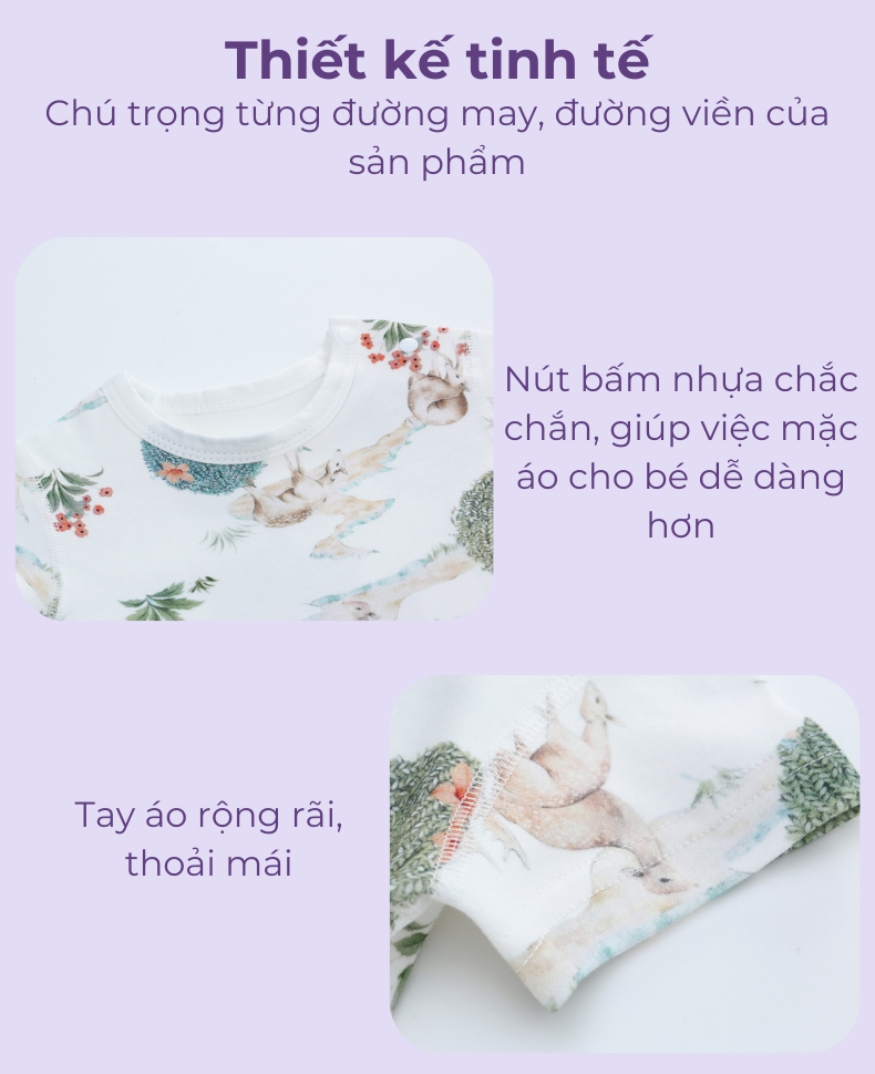 - Đặc tính: Chất vải mềm mịn, sờ mát tay, thấm hút mồ hôi tốt, co giãn đa chiều giúp bé thoải mái khi mặc.