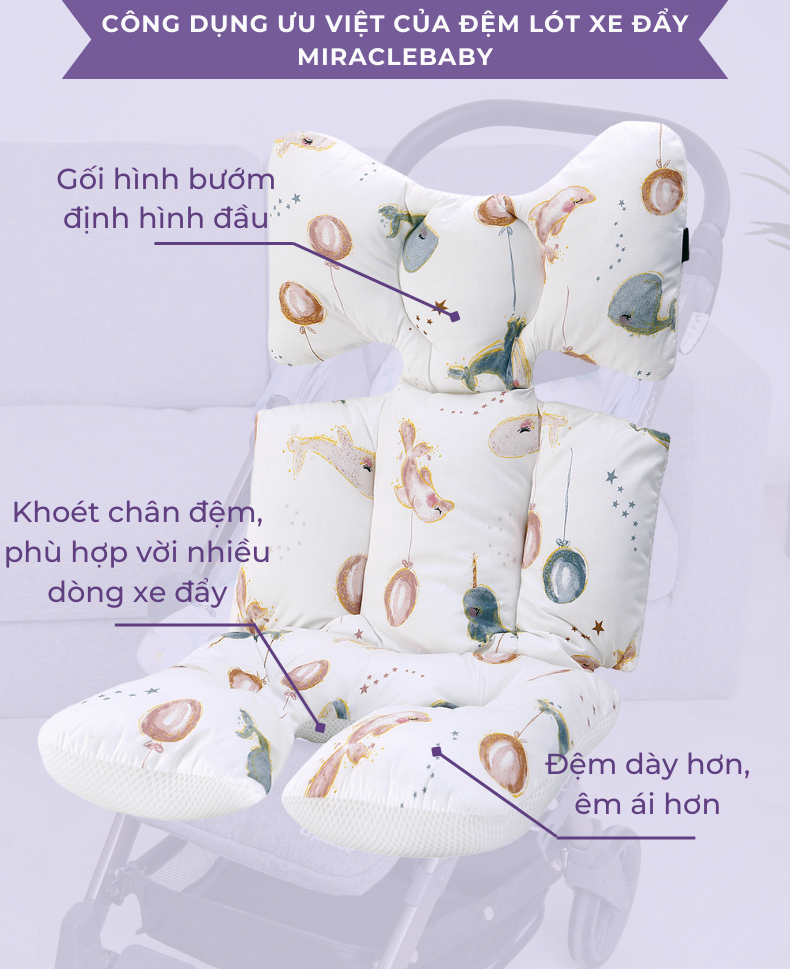 MiracleBaby - Miếng lót xe đẩy dày 6.5cm đệm Cotton dày dặn, phụ kiện xe đẩy êm ái cho bé